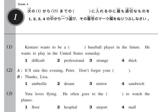 英検4級は、5級に比べると全体的に文章量が多くなり、単語や文法のレベルも上がります。