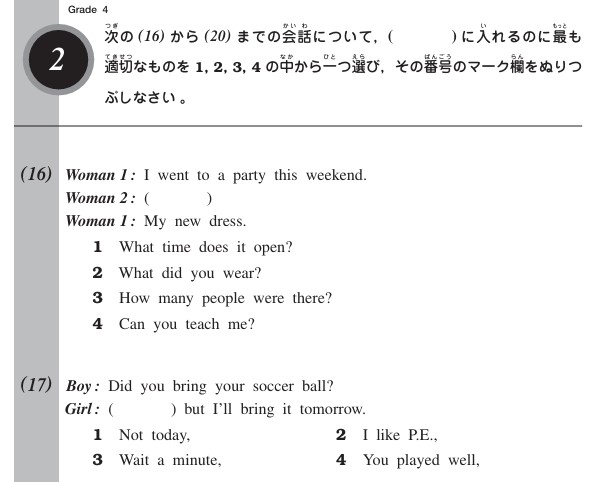 英検4級では、基本的な疑問文の受け答えや、助動詞を使った表現等を重点的に学んでおくと良いです。