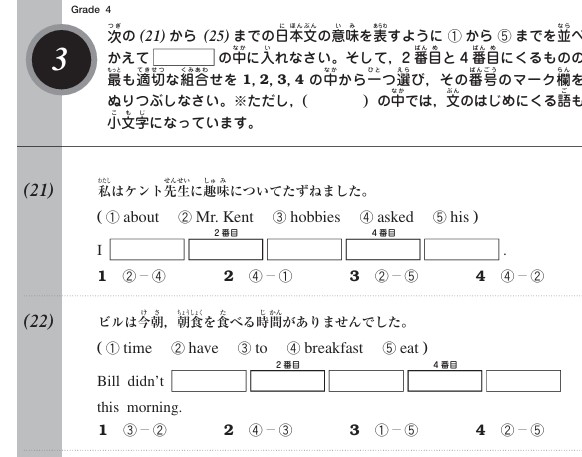 英検4級では、英文法に関連する問題や、正しい英文になるように語句を並べ替える問題が出題されるからです。